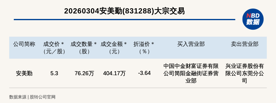 每經(jīng)訊,2026年3月4日,新三板創(chuàng)新層公司安美勤(831288,收盤價:5.5元)發(fā)生一筆大宗交易,成交價5.3元/股,成交數(shù)量76.26萬股,成交金額404.17萬元,折價3.64%。買入營業(yè)部是中國中金財富證券有限公司簡陽金融街證券營業(yè)部,賣出營業(yè)部是興業(yè)證券股份有限公司東莞分公司。