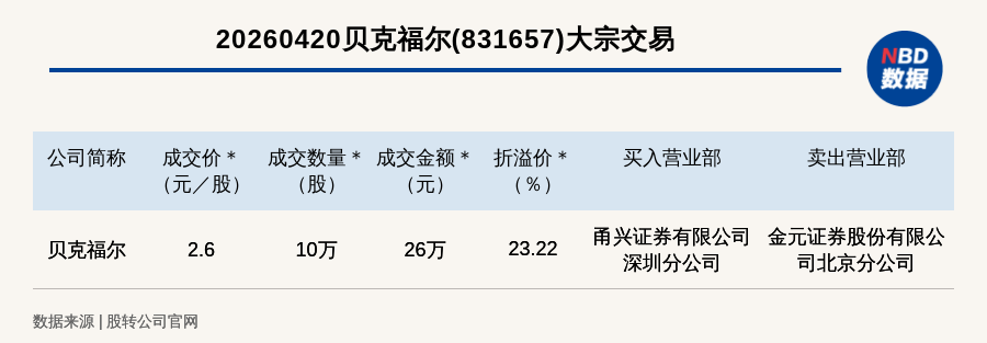 每經(jīng)訊,2026年4月20日,新三板創(chuàng)新層公司貝克福爾(831657,收盤價:2.11元)發(fā)生一筆大宗交易,成交價2.6元/股,成交數(shù)量10萬股,成交金額26萬元,溢價23.22%。買入營業(yè)部是甬興證券有限公司深圳分公司,賣出營業(yè)部是金元證券股份有限公司北京分公司。