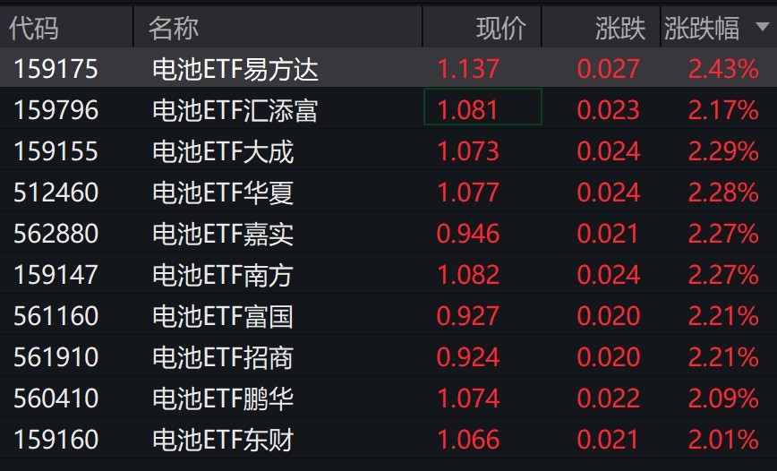 受盤面影響,電池相關(guān)ETF漲超2%。