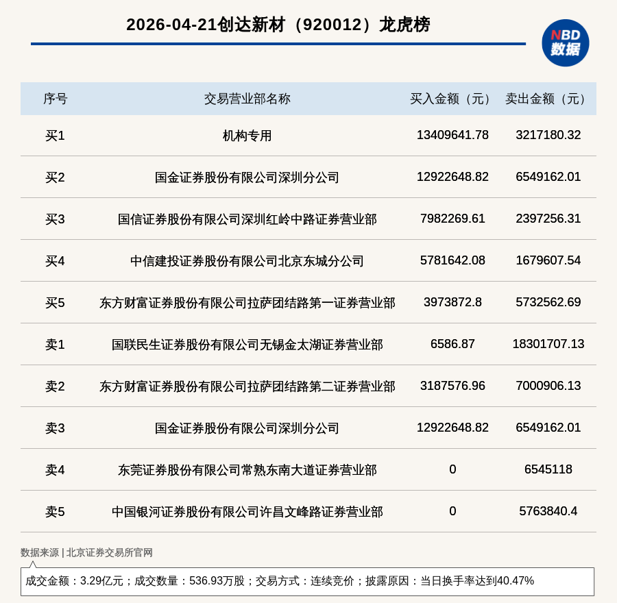 每經(jīng)訊,2026年4月21日,北交所上市公司創(chuàng)達(dá)新材(920012,收盤(pán)價(jià):64.82元)登上龍虎榜,交易方式是連續(xù)競(jìng)價(jià),披露原因是當(dāng)日換手率達(dá)到40.47%,成交數(shù)量536.93萬(wàn)股,成交金額3.29億元。買(mǎi)一席位為機(jī)構(gòu)專用,買(mǎi)入1340.96萬(wàn)元;賣(mài)一席位為國(guó)聯(lián)民生證券股份有限公司無(wú)錫金太湖證券營(yíng)業(yè)部,賣(mài)出1830.17萬(wàn)元。