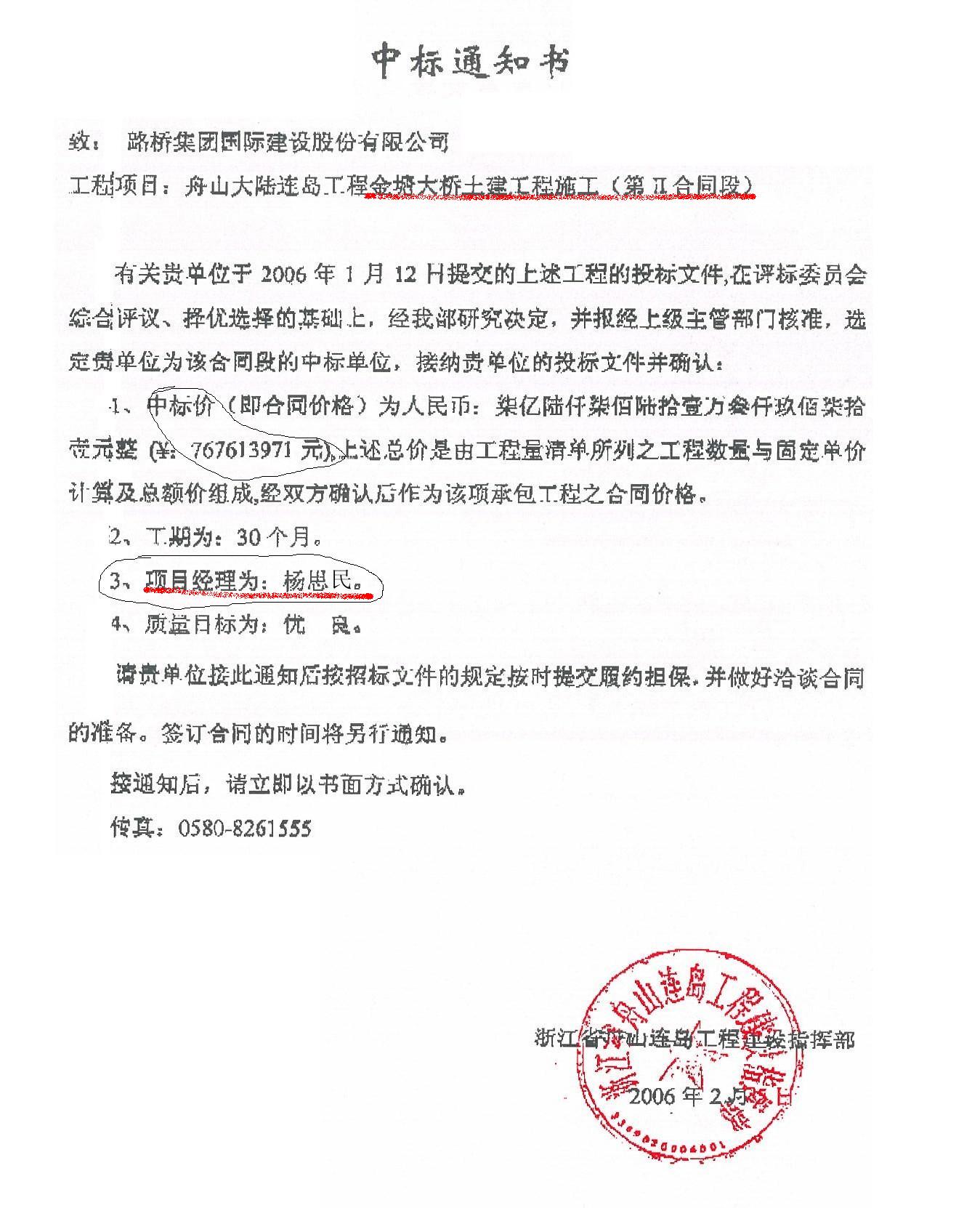 金塘大橋第Ⅱ合同段項目一度出現(xiàn)三個不同的項目經(jīng)理。根據(jù)當(dāng)初“指揮部”發(fā)給路橋建設(shè)的中標(biāo)通知書顯示,項目經(jīng)理為楊思民。